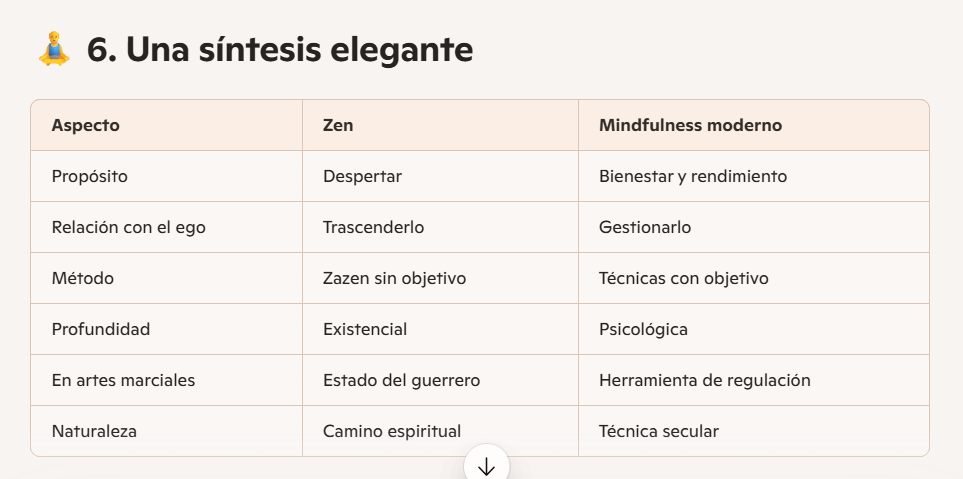 Esta comparación es muy fértil, porque aclara dos caminos que hoy se confunden mucho: el Zen, que es una vía espiritual y existencial milenaria, y el mindfulness moderno, que en su versión más popular se ha convertido en una herramienta psicológica de autogestión dentro del coaching, la PNL y el bienestar corporativo.